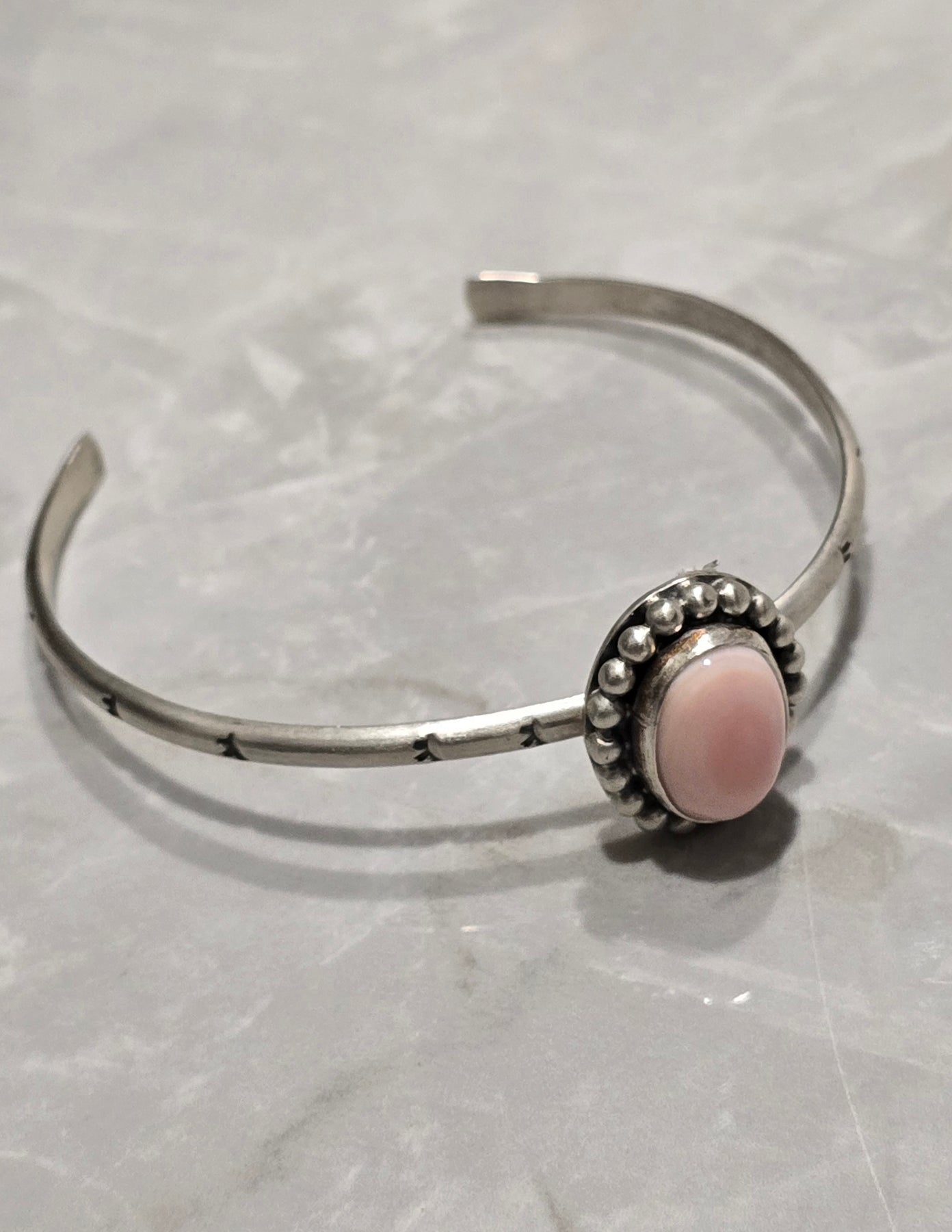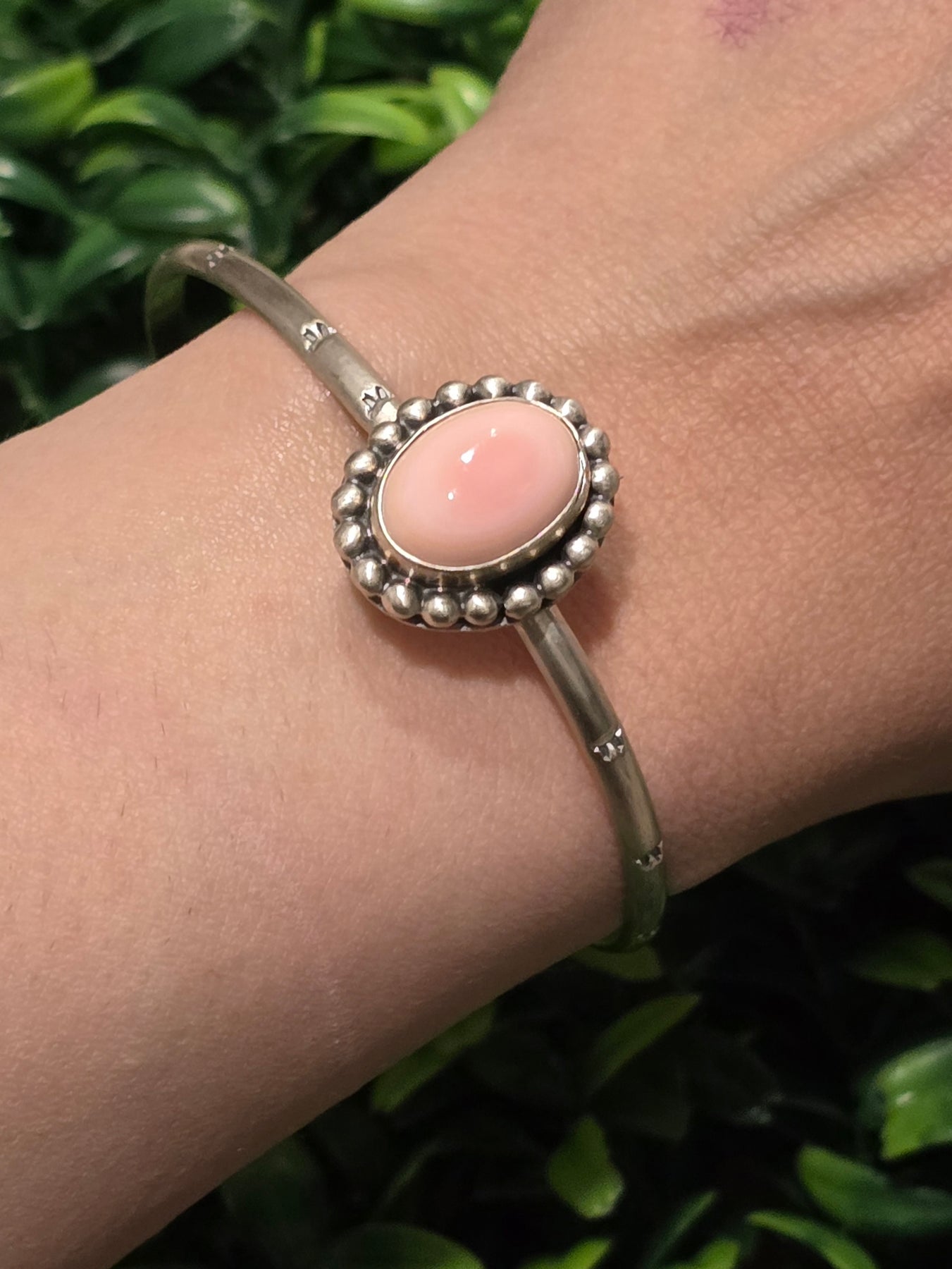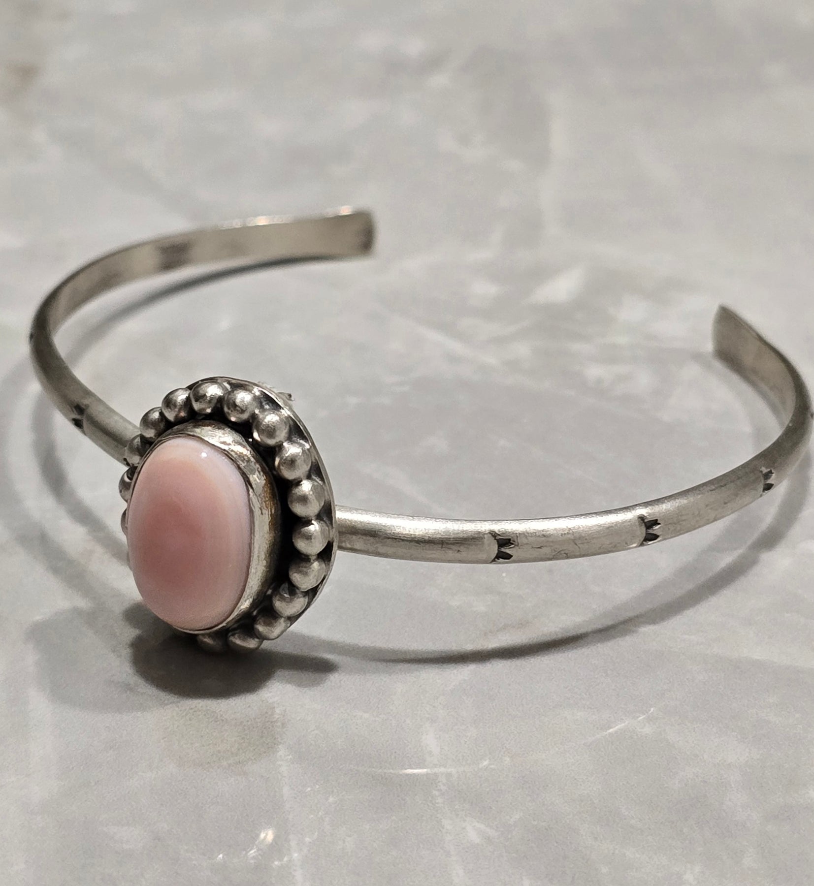 Stamped Sterling Silver Pink Conch Ball Trim Adjustable Stacker Bracelet