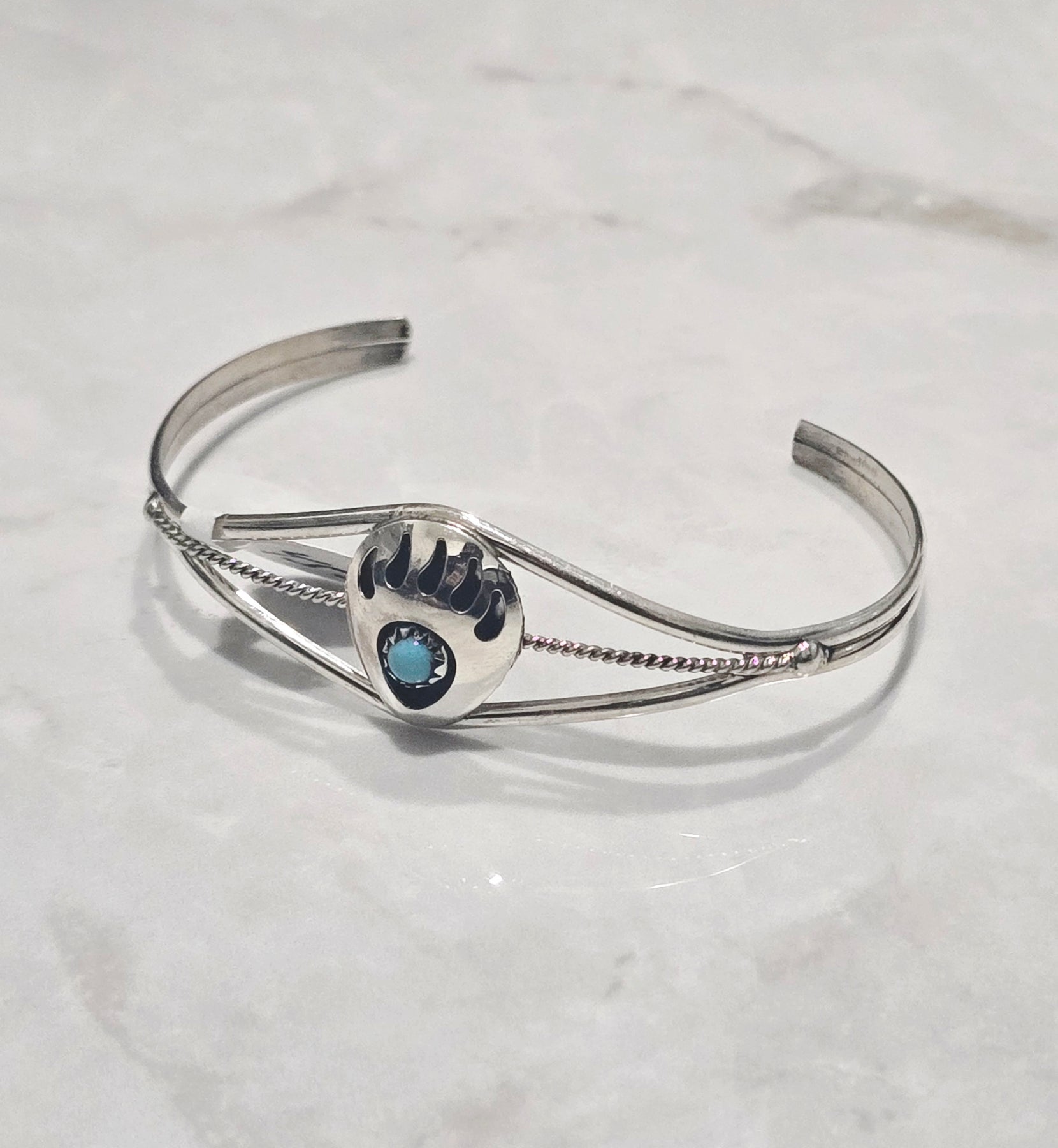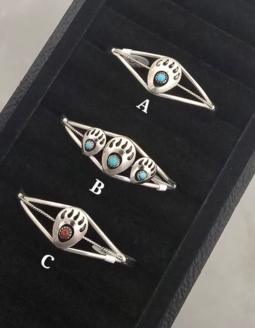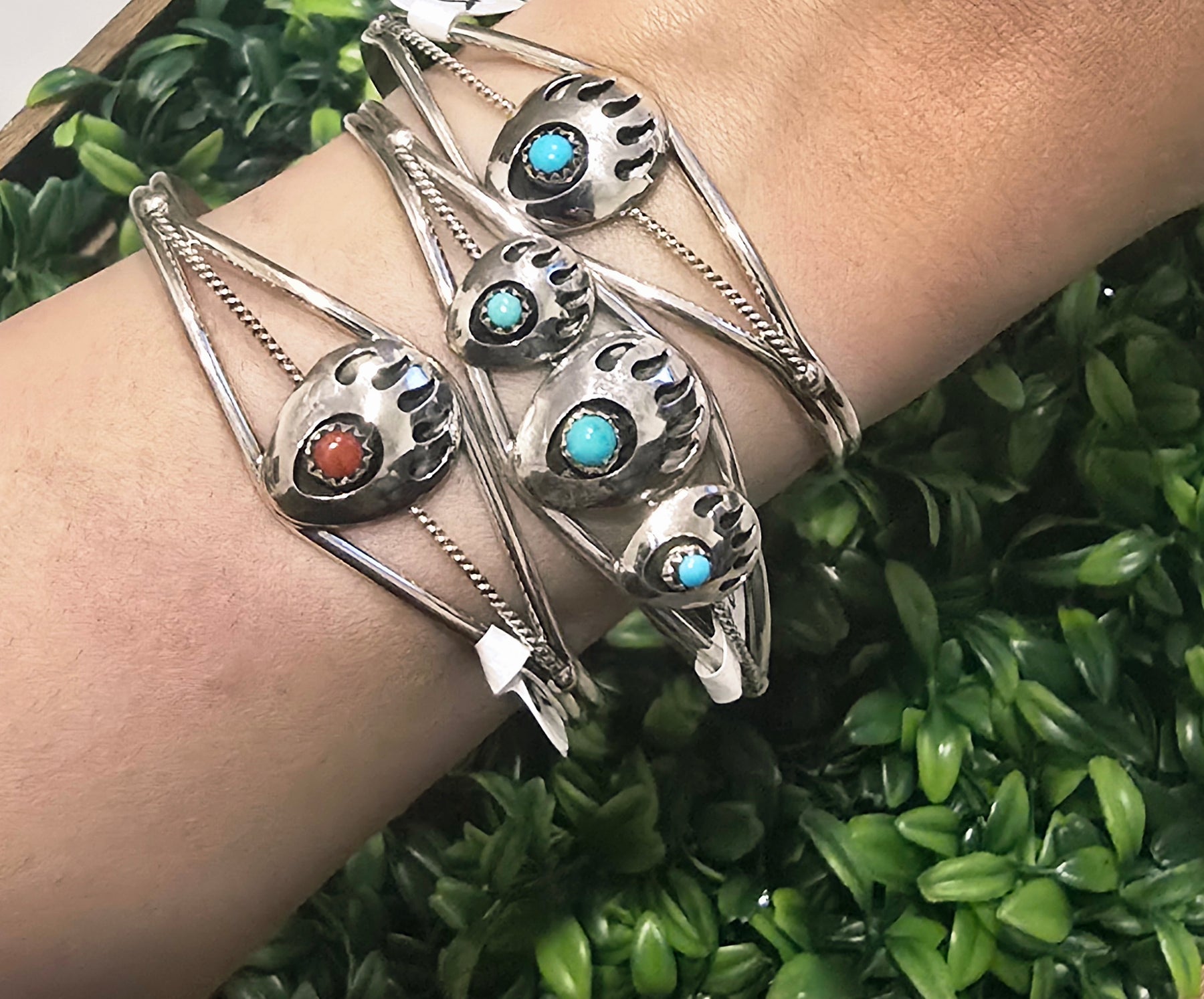 Sterling Silver Turquoise or Coral Bear Paw Adjustable Bracelets